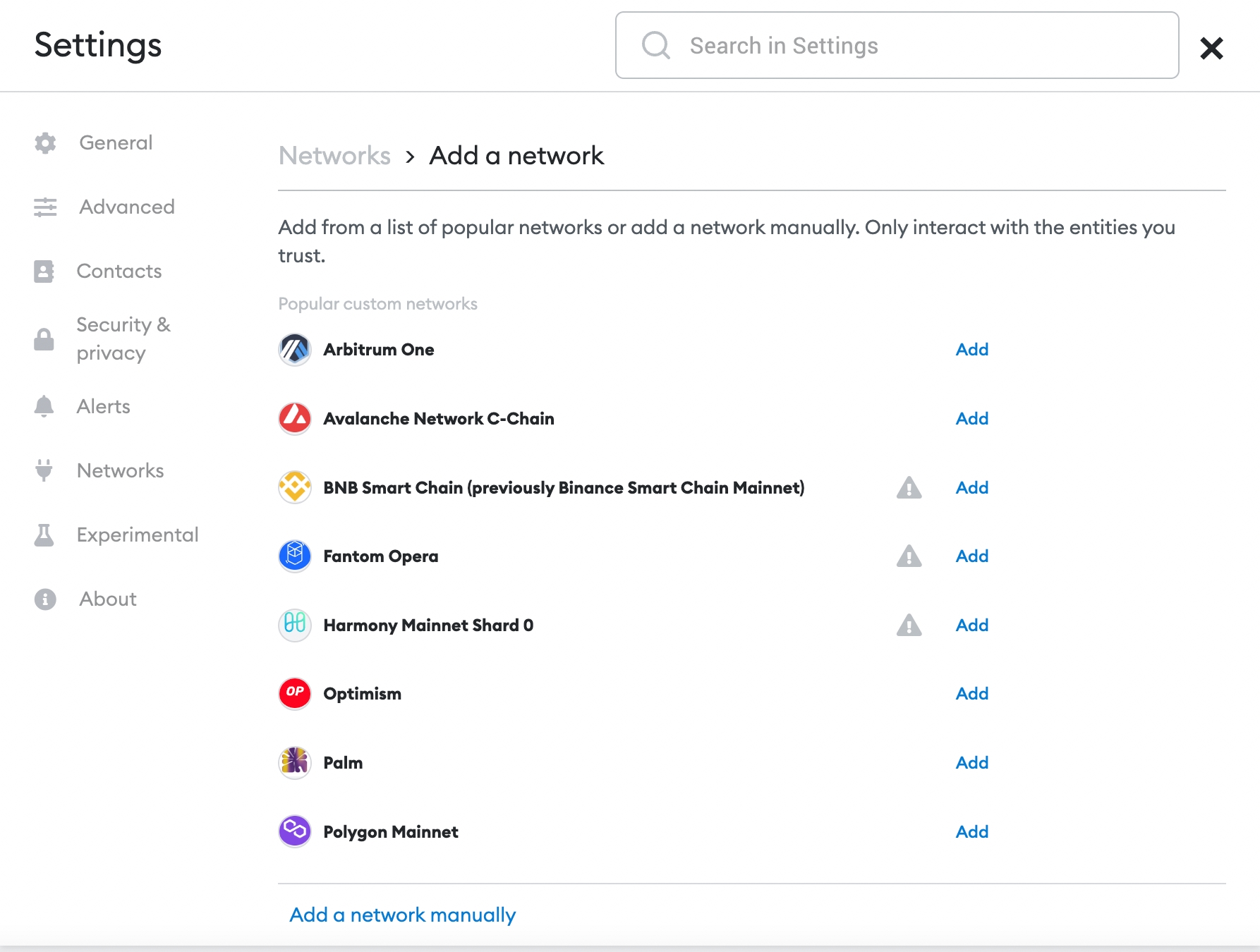 If the user is using Metamask wallet, they should: Click on Settings; Select custom RPC in the drop-down menu; Click "Add a network"; Enter the following info below on the pop-up form: