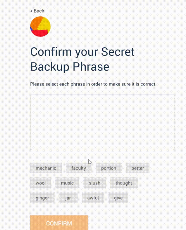 Verify your secret phrase by selecting the proper words in the verification prompts. When done, click "Confirm".